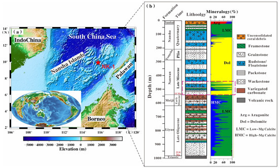 (a) Map showing the Nansha Islands in deep southern South China Sea. The red star indicates the location of Well NK-1. The figure was drawn using GMT 6 software (GMT 6.4.0) and the bathymetry and topography data are from the database hosted by the NOAA (https://www.ncei.noaa.gov/products/etopo-global-relief-model, accessed on 28 January 2024). (b) Stratigraphic information regarding Well NK1, which includes the formation, chronology, lithology, and mineralogy (adapted from Li [21]). The red box represents the stratigraphy of the Lower Nanwan Formation.
