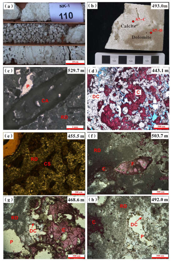 Core photographs and photomicrographs from the Nanwan Formation in Well NK-1. (a) Core photos showing numerous moldic voids around the exposed surface. (b) Grainstone with calcite (white) and dolomite (brown). Red solid circle represents the micro-drilling position for Sr isotope analysis. (c) Replacive dolomite (RD) with coralline algae (CA). Precursor bioclasts structure is well preserved, and there is no dolomite cement at the edge of the pore (P). (d) Dolomitic limestone stained with Alizarin red S showing dolomite cements (DC) floating in the calcite (C). (e) Lime dolostone stained with Alizarin red S showing undolomitized coral skeletons (CS) and fine and dirty replacive dolomite (RD) with cloudy cores and clear rims. (f) Dolomitic limestone stained with Alizarin red S contains undolomitized foraminifera (F). (g,h) Lime dolostone showing replacive dolomite (RD), dolomite cement (DC) at the edge of the void (P), and undolomitized calcite (C). The depths specified in the top right of each image are below the present-day sea level.