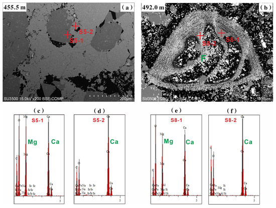 Backscatter images and EDS spot analysis of dolostones within the Nanwan Formation. (a,b) Backscatter images of dolostones at depths of 455.5 m and 492.0 m. Light gray = calcite; dark gray = dolomite; black = porosity. Dolomite is homogeneous, and foraminifera (F) is undolomitized. (c,d) EDS data of the spot from subplot (a). (e,f) EDS data of the spot from subplot (b).