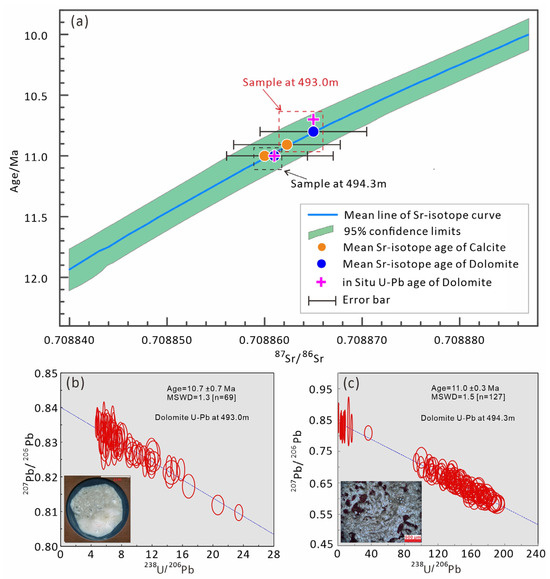 (a) Cross plot of Sr isotope ages and in situ U–Pb ages at depths of 493.0 m and 494.3 m in Well NK-1. Two U–Pb ages of dolomite have a good fit with 87Sr/86Sr isotope ages. (b,c) Harmonic diagram of U–Pb dating in the dolomite zone from two samples. The insert in the bottom left corner of each image shows ablation points of U–Pb dating.