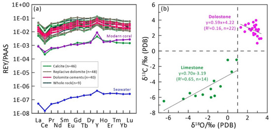 Composite plots. (a) PAAS-normalized REY distribution patterns from calcite, replacive dolomite, and dolomite cement in partially dolomitized carbonates in Unit II using laser ablation. The reference REY data include coral skeletons from the Meiji Atoll [34] and surface seawater in the southern SCS [35]. (b) Carbon and oxygen isotopic compositions of limestone and dolostone. Note that there is a certain correlation between carbon and oxygen isotopes in limestone but not in dolostone.