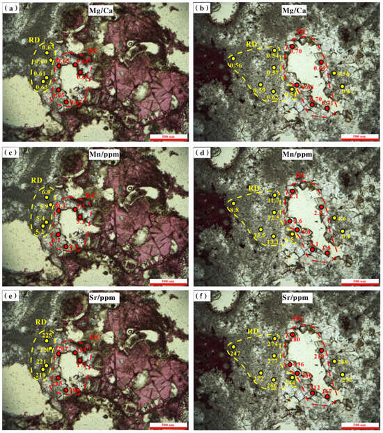 The primary calcites (bioclast) contain 93 to 294 ppm Fe with an average of 135 ppm (n = 47). There are no significant differences in Fe content between replacive dolomite and dolomite cement, with the averages of 108 ppm (56 to 150 ppm, n = 55) and 100 ppm (64 to 139 ppm, n = 31), respectively. The Mn contents of different mineral phases are mostly less than 40 ppm (Figures 9c,d and 10; Table 3), with average values of 14 ppm, 11 ppm, and 6 ppm in calcite, replacive dolomite, and dolomite cement, respectively. No correlation is found between the Fe and Mn contents in calcite, replacive dolomite, or dolomite cement. The Sr content in calcites ranges from 155 to 4103 ppm (average 697 ppm, n = 47), whereas replacive dolomite and dolomite cement have contents of 65 to 277 ppm (average 216 ppm, n = 55) and 112 to 285 ppm (average 207 ppm, n = 31), respectively. Overall, the average Fe, Mn, and Sr contents in the replacive dolomite are higher than those in the dolomite cement at the void edge (Figure 9). The average Mg/Ca ratios in the replacive dolomite are lower than those in the dolomite cement (Table 3, Figure 8 and Figure 9).