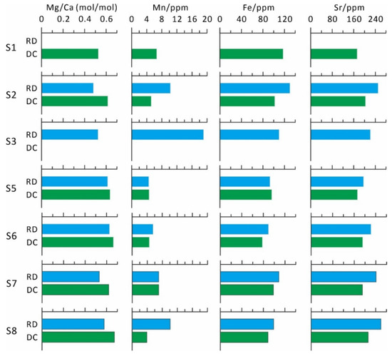4.5.2. In Situ Fe, Mn, and Sr Concentrations and Mg/Ca Ratio