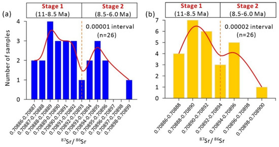 The bimodal 87Sr/86Sr histogram of dolostones also shows that two stages of dolomitization existed in the lower Nanwan Formation at 11.5–8.5 Ma and 8.5–6.0 Ma (Figure 10 and Figure 11b). Two stages of dolomitization have also been found in the Cayman Islands [2,13] and Xisha Islands [5]. The different CL colors of replacive dolomite (bright reddish orange) and dolomite cement (dull bluish gray) also proved the existence of two distinct fluids with different chemical compositions (Figure 5). Available evidence indicates that the two dolomitization events created two types of dolomites in the lower Nanwan Formation. Massive replacive dolomitization produced replacive dolomites (stage 1), and the cementation created dolomite cement around the void edges (stage 2).