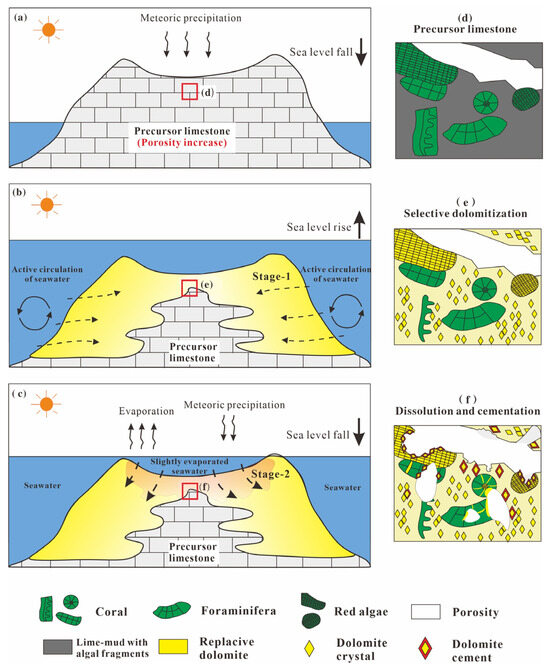 Tectonic activities and sea level changes are important factors influencing the growth and dolomitization of coral reefs [59,60,61]. Tectonic activity in the southern SCS was stable after ~11 Ma, and coral reefs thrived on the Meiji Island [21]. The dolomitization of island carbonates in the SCS is generally considered to be related to sea level changes [28]. Available petrological evidence indicates that the periodic exposure of coral reefs during sea level oscillations (Figure 3a and Figure 12c,d) [28,62,63] resulted in calcification during the Miocene and created dissolved voids in limestones (Figure 12a,d). Subsequently, the intrusion of seawater quickly transformed the low-Mg calcite to dolomite (stage 1: replacive dolomitization, Figure 12b,e) which was followed by the formation of dolomite cement (stage 2, Figure 12c,f).