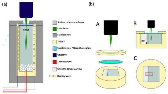 The single crystal experiment was carried out with the polished celestine cuboid and 0.3964 ± 0.0002 mL of the 1 M Na2CO3 solution in a simply designed fluid cell (Figure 1b). The geometrical surface-to-solution ratio was ~0.011 m−1. After filling the fluid cell with the solution, it was immediately sealed with a 170 ± 5 µm thin borosilicate glass plate (SCHOTT D263M) (SCHOTT AG, Mainz, Germany) and placed on the x-y-z table of the Raman microscope. Since the fluid cell cannot be heated, the experiment ran at room temperature, monitored to be 21.0 ± 0.5 °C (air-conditioned laboratory), for about 10 days and thus lasted significantly longer than the powder experiments.