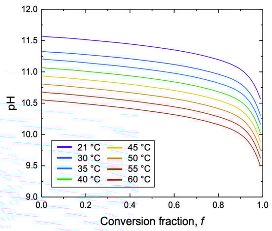 Modelled pH as a function of conversion fraction of celestine to strontianite for all eight experimental temperatures. Modelling was performed with the geochemical program PHREEQC using the SIT database [21].