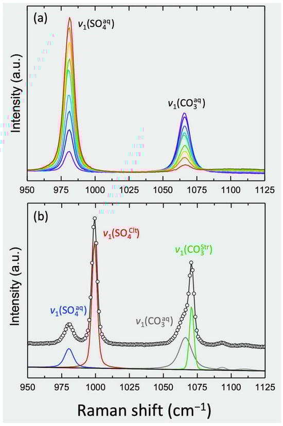 A Raman spectrum evaluation and a least-squares spectrum fitting were performed with the Horiba Scientific LabSpec6 software (HORIBA, Ltd., Kyoto, Japan), whereas the data analysis program OriginPro9 (OriginLab Corporation, Northampton, MA, USA) was used for all other data evaluations. As the first step, each spectrum was corrected for any spectrometer shift by fitting the Ne line at 1707.06 cm−1 with a Gauss function and shifting the spectrum by the difference between the observed and known frequency. The Raman spectra were then analysed in the frequency range between 900 and 1200 cm−1, covering the energy range of the four fully symmetric stretching (ν1) modes of aqueous and solid SO42− and CO32− groups at about 980, 1000, 1066, and 1072 cm−1 [28,29]. As expected, Raman spectra from the powder experiments show only the ν1(CO3) and ν 1(SO4) bands of the aqueous phase near 980 and 1066 cm−1, respectively (Figure 3a). The situation is different for the single crystal experiment. Here, due to the limitations of the spatial resolution, areas close to the celestine–strontianite–solution interfaces show all four bands (Figure 3b).