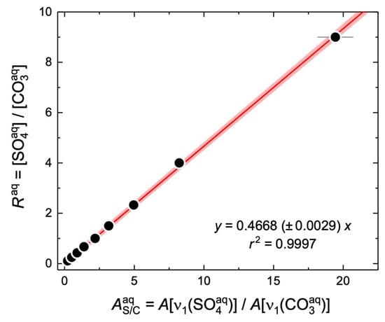 To convert the Raman intensity ratio between the 1(CO3) and 1(SO4) band of the aqueous phase,, into the molar ratio, , we prepared solutions from Na2CO3 and Na2SO4 with known molar ratios, recorded a Raman spectrum at room temperature, and determined AS/C from the Raman spectrum. In Figure 4, we have plotted the known molar Raq ratio against and fitted a calibration line to the data. The Raq of the solutions was then obtained by multiplying the measured intensity ratio with the slope of the calibration line, i.e., with 0.4668 ± 0.0029. From the molar ratio, we also calculated the molar conversion fraction of celestine to strontianite, f, from
