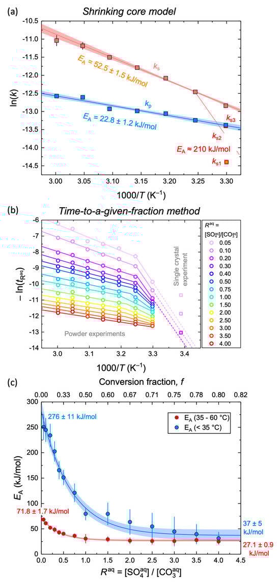 Here, we assign the empirical activation energy of 71.8 ± 1.7 kJ/mol, obtained via the time-to-a-given-fraction method from the ≥35 °C data at the beginning of the reaction, i.e., far from equilibrium (Figure 7b,c), to the onset of the second kinetic regime of the overall replacement process where the reaction kinetics become ICDP-limited and may be autocatalytical. This value accords well with the apparent activation energies of 64.1 and 70 kJ/mol obtained by fitting shrinking core models to experimental ex situ data [10,12]. Using the model of Castillejos et al. [12], however, we obtained a significantly lower apparent activation energy of 22.8 ± 1.7 kJ/mol (Figure 6b and Figure 7a). We nevertheless consider this value to be meaningful because it accords very well with an Ea of 21.6 kJ/mol, reported by Suarez-Orduna et al. [16], and also well with the value of 27.1 ± 0.9 kJ/mol that was obtained in this study via the time-to-a-given-fraction method at infinite conversion progression. Suarez-Orduna et al. [16] obtained a low apparent activation energy from hydrothermal experiments performed between 150 and 250 °C with several millimetre-large single crystal plates. Under such conditions, the initial kinetic steps identified in this study are rate-limiting only in the first minute(s) of the experiments. The measured apparent activation energy therefore likely reflects the final transport-controlled kinetic regime that is established once a certain thickness of the strontianite layer and thus a kind of steady state between transport and celestine dissolution at the ICDP interface has been reached. In this context, it is important to mention that there is evidence that porosity decreases roughly exponentially with an increasing reaction time (so the transport rate within the strontianite layer), slowing the reaction rate [38].