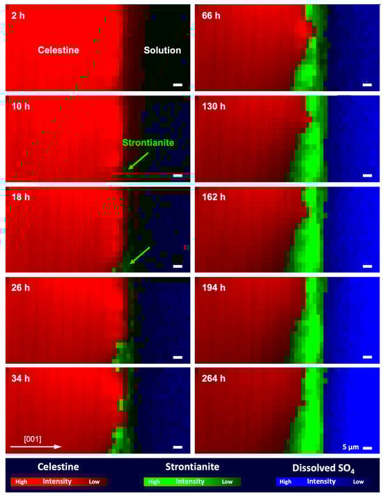 Figure 8 shows representative hyperspectral Raman images of the replacement of celestine (red) by strontianite (green) which were recorded in situ at different times while the reaction was in progress. It can be seen from the images that with increasing time, more and more strontianite replaced the celestine crystal along an uneven reaction front whereby the replacement reaction continuously slowed down. A contemporaneously increasing aqueous sulphate concentration is represented in the images by an increasing amount of the blue colour of the area occupied by the solution. At the end of the experiment, the strontianite rim within the imaged area reached a final thickness between ~10 and 15 µm.