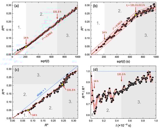 Kinetic analysis of the isothermal single crystal experiment. The three kinetic regimes are indicated by distinct inflection points that are marked by yellow circles in the diagrams. (a) Raq versus the square root of time with a linear regression line through the data of the 2. and 3. kinetic regimes with its 95% prediction band. (b) Rs versus the square root of time with a piecewise linear regression through the two linear sections and the 95% prediction band. The intersection of the two linear segments defines a clear inflection in the reaction trend. (c) Raq versus Rs with stippled red lines that are guides to the eye only. (d) Raq/Rs as a function of time, showing regular oscillations. The red envelope following the oscillations was calculated by finding all points in the data whose first-order derivative is zero, through which a cubic spline interpolation was then performed. For more details, see text.