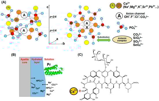 (A) Sketch of the three-dimensional structure atomic structure of apatite showing substitution possibilities in geological environment and in living organisms; viewed perpendicular to the c-axis and down the c-axis; (B) the non-apatitic environment -hydrated layer and surface reactions containing loosely bound ions that can be exchanged by foreign ions and molecules, such as charged groups of proteins (Pr) []. (C) The chemical structure of vancomycin, “*” indicates the binding site of calcium to the carboxyl group of vancomycin.