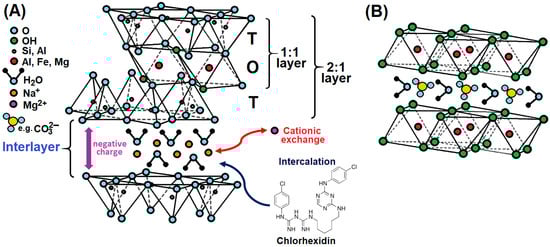 Natural phyllosilicates are ionic and hydrophilic in nature, leading to water swelling. Chemical modification can lead to an increase in the d-spacing and induce organophilic properties in the clay, which is a fundamental reaction for making clay minerals hydrophobic, as required in the preparation of polymer–clay composites []. Organic compounds can interact with clay minerals through various types of reactions, such as adsorption on the external and internal surfaces, exchangeable ion exchange on the external and internal surfaces, and grafting reactions with silanol and aluminol groups, leading to covalent bonds and intercalation. Intercalation refers to the penetration of organic molecules into the interlayer space of clay minerals. Polar organic molecules are able to displace the water molecules in the interlayer space, while neutral organic ligands can form complexes with the interlayer cations, but the interlayer cations can also be exchanged by different types of organic cations. The physico-chemical principles of these reactions have been described in detail by Lagaly et al. []. The interaction of clay minerals with various types of proteins, drugs (Figure 2A), etc., has been intensively studied.