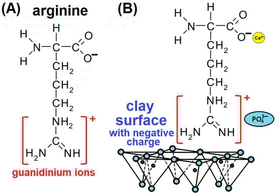 Figure 3. Schematic diagram of the structure of (A) arginine with marked guanidinium ions and (B) possible interactions of arginine with the clay surface proposed by Li et al. [].In recent years, 3D printing has become widely used and popular as a powerful technique for producing prototypes with accuracy and complexity of internal and external structures. Currently, 3D printing has been very successful in the production of bone scaffolds for orthopaedic applications [] and is being used to produce innovative medical devices. Faksawat et al. [] have used the 3D-printing technique to produce a specific bone shape by mixing raw clay and HA followed by sintering. Different clay/HA ratios and sintering temperatures affect the physical and mechanical properties. An interesting modification of 3D printing is fused filament fabrication, also known as fused deposition modelling. This 3D-printing process uses a continuous filament of thermoplastic material (polymer), which is usually heated to a molten state and then extruded through the nozzle of the 3D printer. Printers extrude a thermoplastic filament in a series of layers over a build plate to create a three-dimensional object. This technique has been used to build polymer-based scaffolds, such as PLA [] and PCL [,], which contain clay and HA as fillers. - The second group relates to processes based on chemical principles. Charged powder particles dispersed in a liquid medium are attracted and deposited onto an oppositely charged conductive substrate by the application of an electric field. Electrophoretic deposition (EPD) is an interesting electrochemical method for processing bulk and coating materials that is attracting increasing interest due to its simplicity, ability to produce smooth coatings, and ability to deposit on complex shaped parts. Despite the simplicity of this method, a large number of parameters can influence the deposition properties [,]. Molaei et al. [] used EPD to develop a novel chitosan (CHS)-bioactive glass-HA-halloysite nanotube (HNT) composite layer deposited on titanium substrate to enhance corrosion resistance and bioactivity. In their previous work [], the authors demonstrated that the presence of HNTs in the CHS coating prepared by EPD provided better apatite-inducing ability compared to pure CHS. They proved the deposition of carbonated HA around the HNT particles. CaPs can be formed by combining calcium cations (Ca2+) with phosphate anions (PO43−) from simulated body fluid (SBF).The electrostatic interaction, without the use of an electric field, between Ca2+ cations and clay anionic groups enables in situ precipitation of apatite nuclei, and the electrostatic interaction between Ca2+ and PO43− ions induces the growth of apatite structure. This process is referred to as a “biomimetic approach”, which refers to man-made processes, substances, devices, and systems inspired by natural phenomena, such as biomineralisation []. Wan and Chen [] were the first to publish the use of clay (surface-modified sepiolite—SEP) for in situ growth of HA. A negative surface charge may allow the growth of HA nanocrystals with controlled sizes. Surface-modified (acid activation) SEP particles with higher porosity, caused by acid extraction of magnesium (Mg2+) ions from the octahedral sheets and abundant silanol groups on the surface, make them more promising to induce HA biomineralisation. The authors have proposed the nucleation mechanism of HA on SEP. Si-OH groups at the edge of surface channels and some pore defects in the original SEP may interact with Ca2+ cations through electrostatic interactions and act as nucleation sites for HA formation (Figure 4A). The abundant Si-OH groups on the acid-activated SEP are able to attract more Ca2+ cations into the mesopores. In addition, Ca2+ cations could enter the octahedral positions originally occupied by Mg2+ cations, leading to local supersaturation of Ca2+ cations and facilitating the nucleation and growth of HA nanocrystals. The clay mineral therefore influences the precipitation process. As a result, clay enables the formation of smaller HA particles that bind to the clay particles and influence the resulting texture of the HA particles, as demonstrated by Broda et al. []. Jamil et al. [] studied the influence of Na-MMT concentration on the formation of the crystalline structure of CaPs and the incorporation of clay ions into the apatitic structure. The addition of Na-MMT affects the size of the apatitic nanoparticles; a low concentration (2 wt%) improved their dispersion, while a higher concentration (10 wt%) promoted their agglomeration. CaP precipitation also affects the original structure of the clay mineral when exfoliation or delamination occurs (Figure 4C). Exfoliation (Figure 4B) is the decomposition of large aggregates into smaller particles, whereas delamination is the process of separation of individual layers from the particles []. Pazourková et al. [] demonstrated by X-ray diffraction (XRD) and scanning electron microscopy (SEM) that CDH was precipitated on the surface of Na- and Mg-MMT, but they could not demonstrate the intercalation of CDH into the MMT interlayer using infrared analysis. Infrared bands were superimposed, and spectra fitting showed no significant changes. Jamil et al. [] also applied the annealing process up to 1100 °C followed by biomimetic preparation, which induced a change from the original CaP phase (HA) to β-TCP. Rumi et al. [] have used annealing temperatures from 600 to 1000 °C to form the backbone of the phosphate binder, in a system containing perlite and kaolinitic clay, using calcium carbonate in reaction with phosphoric acid. The biomimetic approach can also be used when clays need to be modified with organic surfactants. Liu et al. [] have synthesised cetyltrimethylammonium bromide (CTAB)-modified HA-bentonite (BNT) composites using a one-step hydrothermal method. Although the intercalation of CTAB into the BNT interlay