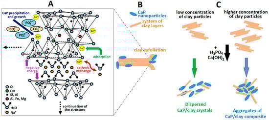 Figure 4. Schematic illustration of (A) CaP nanoparticle precipitation on the clay surface and interlayer, (B) exfoliation of the clay layer system, and (C) formation of dispersed and aggregated CaP/clay particles, as proposed by Jamil et al. [].