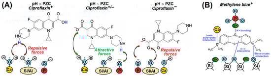 Much more complex interactions occur between the CaP-clay system and complex organic molecules such as drugs [,] and dyes. Thermodynamic analysis by Laab et al. [] showed that the adsorption of the antibiotic Ciprofloxacin on HA/MMT was spontaneous and endothermic with a physisorption character. The binding mechanism at the liquid/composite interface involved the synergistic interplay of electrostatic forces, hydrophobic interactions, n-π electron donor–acceptor interactions, and H-bonding, which was strongly influenced by the pH of the solution (Figure 5A) []. Dyes used in the textile, tanning, and food industries tend to generate toxins and carcinogens. Wastes containing organic dyes reduce the concentration of dissolved oxygen in natural waters, thereby preventing light penetration and inhibiting photosynthesis in plants. They can also form coordination compounds with some toxic metal ions. Methylene blue (MB) is a commonly used cationic dye for dyeing textiles such as cotton, wool, and silk. Cationic dyes are reported to be more toxic than anionic dyes.