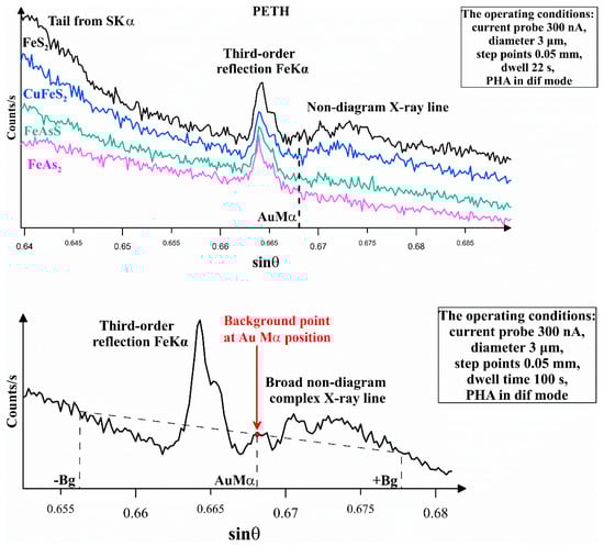 The determination of trace concentrations of Au was performed as described below. It is known that the Au concentration can be measured using the LIFH crystal at the Au Lα-line and the PETH crystal at the Au Mα- and Mβ-lines. The spectral data that we collected close to these lines showed: (i) a “hole” (decrease of the signal) at the short-wavelength side of the Au Lα-line described in []; (ii) a narrow band of the third-order reflection Fe Kα close to the Au Mα-line; (iii) a first identified broad non-diagram X-ray line whose intensity is proportional to the S content (Figure 1, top); and (iv) the Au Mβ-line, which is close to the S Kα-line. To eliminate the effect of the above factors on the determination of low Au concentrations, it is necessary to accurately determine the background shape near the Au analytical lines.