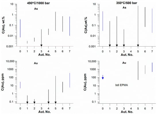 Variation of the concentrations of As and Au in the synthesis products. Black lines—35 wt.% NaCl; blue lines—15 wt.% NaCl. Arrows indicate that some values are below the detection limit of analytical method. The autoclave number is indicated on the X axis. Results of EPMA and LA-ICP-MS.