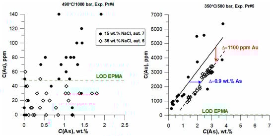 Analysis of Figure 4 reveals an important feature of the effect of chlorides on the behavior of Au in arsenian pyrite. The figure shows EPMA data for two samples synthesized with equal initial As content in the starting As + FeS mixture. At 490 °C, a positive Au–As correlation appears at C(NaCl) = 15 wt.% and As concentration in the synthesized pyrite > ~1 wt.%. At C(NaCl) = 35 wt.% the Au concentration is close to or below the EPMA LOD of 48 ppm. At 350 °C, a positive Au-As correlation was observed at both NaCl concentrations of 15 and 35 wt.%. Since an increase in NaCl concentration leads to a decrease in Au content in pyrite, the positive Au-As correlation at high C(NaCl) starts at a higher As concentration. Therefore, the line that approximates the Au vs. As dependence is shifted towards a higher As concentration with an increase in C(NaCl) (Figure 4, right panel). The difference in Au concentration in pyrite with the same As concentration is about 1100 ppm, i.e., an increase in C(NaCl) of 1 wt.% causes a ~60 ppm decrease in the Au concentration at the same As content. As follows from the figure, the decrease in Au content, caused by an increase in the NaCl concentration by 1 wt.%, is compensated by an increase in the As content in pyrite by ~0.05 wt.%.