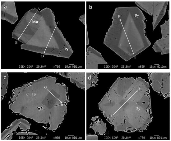 BSE images of grains that were used for EPMA analyses along profiles. The profiles are shown by arrows. (a,b)—Exp. Pr#5, aut. 6, 5 wt.% As in the starting As + FeS mixture, 35 wt.% NaCl in the fluid; (c,d)—Exp. Pr#5, aut. 5, 2.5 wt.% As in the starting As + FeS mixture, 35 wt.% NaCl in the fluid. Profiles A–B and C–D include two lines for each profile with steps 3 and 6 µm, profile E–F—step 9 µm, profiles G–H, I–J—step 5 µm. The grain of marcasite was identified by EBSD.