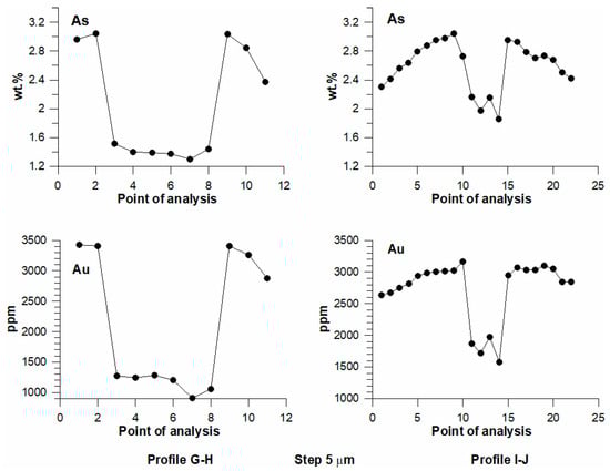 EPMA results for As and Au in pyrite grains (Figure 5c,d) along profiles G–H (left) and I–J (right).