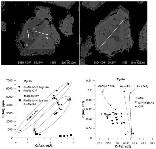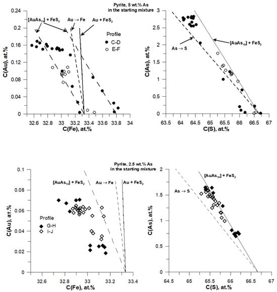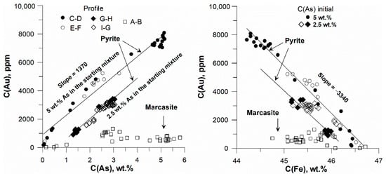 Figure 7 presents EPMA data (weight units) for zonal crystals of pyrite and marcasite, as shown in Figure 5. For all profiles across pyrite grains, strong direct correlation Au–As and strong inverse correlation Au–Fe are observed. The parallel regression lines are shifted along the C(As) and C(Fe) axes depending on the initial As content in the As + FeS mixture. An increase in the starting As content results in elevated concentrations of Au. Data of profile I-G, which correspond to the 2.5 wt.% As in the starting mixture, are separated into two groups in the C(Au)-C(Fe) plot. The first group with low measured As content is close to the regression line describing the mixture with initial 5 wt.% As, but as the measured As concentration increases, the points shift towards the second line of initial 2.5 wt.% As. Nonetheless, all the points for this profile fall within the region confined by two regression lines.