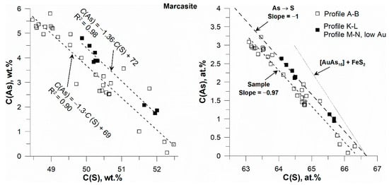 Variations of Au vs. As (left) and Au vs. Fe (right) in pyrite and marcasite. Concentrations are in weight units. Points—results of EPMA analysis along profiles shown in Figure 5, lines are linear approximations of the measurement results. Points that cross the X axes correspond to EPMA detection limit.