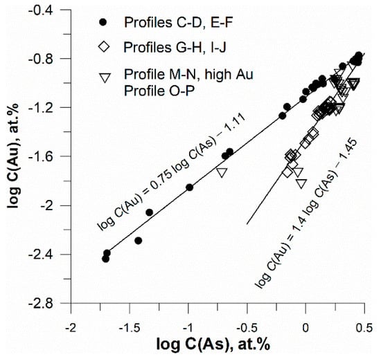 The concentrations of Au and As, measured in all grains of pyrite described above, are plotted as log at.% in Figure 11. The EPMA data are described by two linear dependencies. The line with a smaller slope was obtained by the regression of points obtained for high initial As content (5 wt.%) in the As + FeS mixture; the second line with a sharper slope was calculated by the regression of data for lower starting As content of 2.5 wt.%. The other points for profiles shown in Figure 9, exhibiting higher scatter, are also grouped near these lines. The lines intersect at log C(Au) = −0.71, and log C(As) = 0.53 (at.%). This point probably corresponds to the maximum content of Au–As clusters at a given temperature.