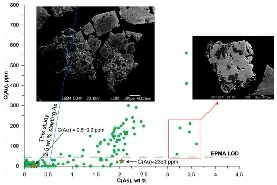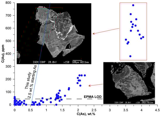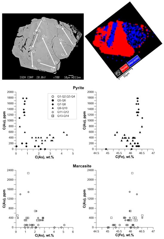The data obtained for marcasite can be divided into two groups. The first group corresponds to low As concentrations ≤ 1 wt.%. In two points with C(As) < 0.5 wt.%, the Au concentration is below the EPMA LOD, and in two other points with C(As) = 0.58 and 1.01 wt.%, the Au concentrations are 110 and 200 ppm, respectively (Table S5). This small data set does not allow us to unambiguously define the effect of As on the Au concentration. From the available data, it follows that in this region, the concentrations of these elements may be directly correlated. In all other points with high As content ≥ 2.5 wt.%, the concentrations of Au and As are not correlated. The absence of Au–As and Au–Fe correlations in marcasite is clearly seen in Figure 7.