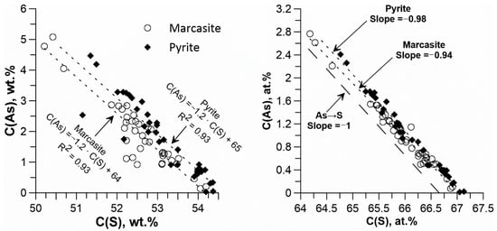Figure 22 (bottom) shows the variation As vs. S in the atomic percent scale. The points (EPMA data) are grouped around the trend with the slope of the As→S solid solution. The close agreement between the measurement results and the solid solution model line implies a negligible contribution of the As→Fe substitution described in [,] in the studied samples.