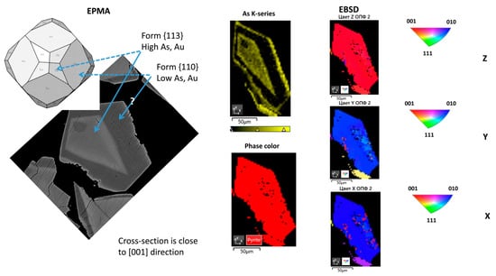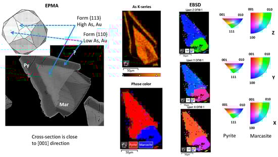 The cross-sections of two grains of well-crystallized minerals with a zonal distribution of Au and As were studied by means of EBSD. The results of the analysis are shown in Figure 14 and Figure 15. The phase color and inverse pole figures show that the first studied sample is an intergrowth of pyrite and marcasite grains (Figure 14), whereas the second sample is a single pyrite grain (Figure 15). The inverse pole figures demonstrate that the cross-section of both pyrite crystals are oriented close to the [001] direction. The observed zoning of Au and As concentrations can be described by the combination of {100}, {110}, and {hhl} forms. The {hhl} form cannot be unambiguously defined, but most probably the central part of the crystals is the {113} form. This form has a strong affinity to Au and As. As follows from the reconstruction of zoning geometry performed using the SHAPE program, the second form, which borders the central {113} form and has a lower affinity to Au and As, can be {110}.