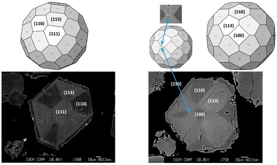In natural pyrite, the {100}, {111}, and {210} faces are most frequent [], whereas in our samples only traces of the {210} form were found. It is known that the surface of a real crystal has defects and imperfections. During crystal growth, the attachment of a particle to the site of a local dislocation (imperfection) is energetically most favorable []. The Au-As clusters, formed on the pyrite surface, are a kind of imperfection. They can act as seeds and enhance the growth rate. As the affinity of {210} form to Au and As is the highest, these faces exhibit the highest growth rate in As-rich auriferous pyrite. The higher the growth rate, the lower the probability of face formation. As a result, the {210} faces are replaced by the neighboring {113} ones, which pose a lower growth rate because of the lower content of imperfections—the Au–As clusters. Natural arsenian pyrite is formed by fluids with a much lower Au concentration and, accordingly, contains less Au. For this reason, the {210} faces are abundant, whereas the {113} form is rare. This conclusion can be verified by means of the analysis of the typomorphism of natural arsenian pyrite crystals of contrast Au content.