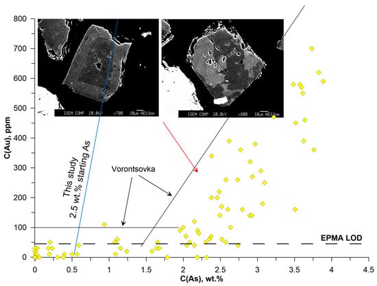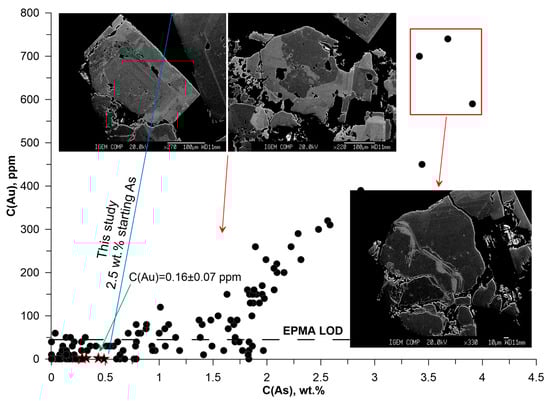 Variation of Au vs. As in pyrite from the sample “Vorontsovka black” (weight units). BSE images illustrate several grains that were used for EPMA. Points—EPMA data, stars—LA-ICP-MS data (the average Au concentration is given for LA-ICP-MS data). Line corresponds to the experimental data obtained for pyrite synthesized using the 2.5 wt.% As + FeS starting mixture (cross-sections G–H + I–J in Figure 5, Exp. Pr#5, aut. 5). The electron microprobe analysis is performed on individual points (not profiles).