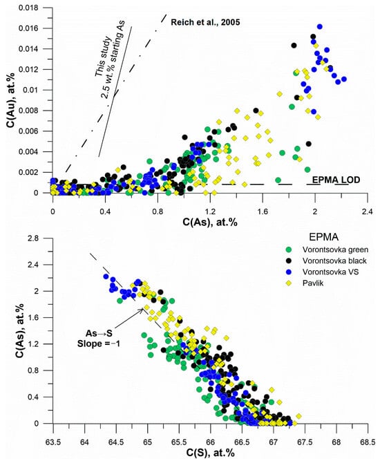 Top: Variation of Au vs. As in all studied natural samples (atomic percent scale). Dash-dotted line—equation from [], solid line—describes the experimental data obtained for the 2.5 wt.% As + FeS starting mixture. Horizontal line shows the EPMA detection limit. Bottom: variation of As vs. S (atomic percent scale).
