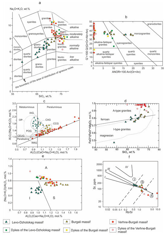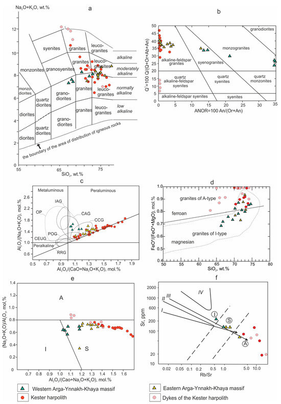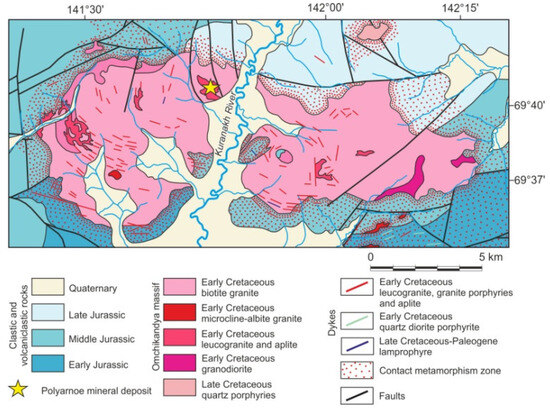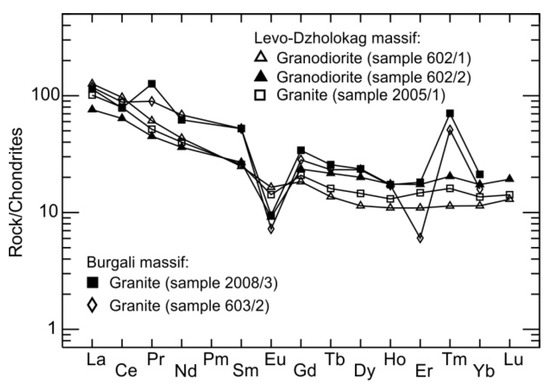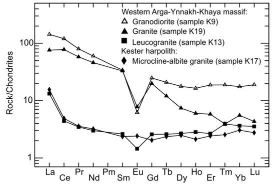 - Trunilina, V.A.; Prokopiev, A.V. Petrology of Granites of the Tommot Rare-Earth Ore Field (Verkhoyansk-Kolyma Orogenic Belt). Minerals 2022, 12, 1347. [Google Scholar] [CrossRef]