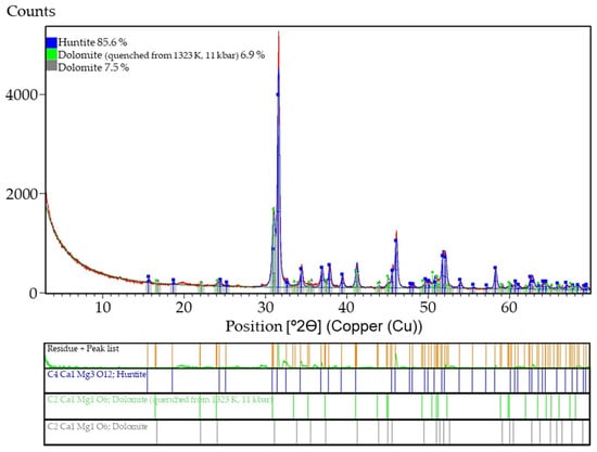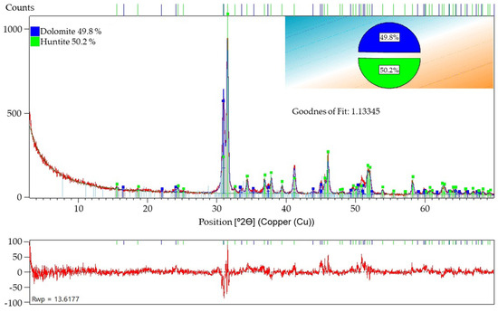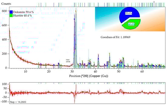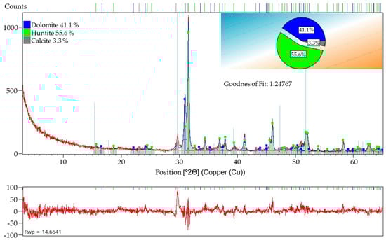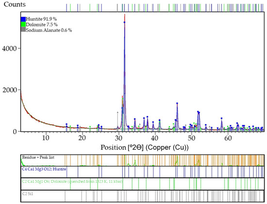 As a result of the solid ratio experiments, the H-1 sample indicated a similar trend in terms of MgO/CaO ratio; however, the H-2–3 sample yielded similar MgO/CaO ratios with different contents for 10% and 20% solid ratios (32.7% MgO and 16.4% CaO for 10% solid ratio, and 30.5% MgO and 15.3% CaO for 20% solid ratio). However, the H-2–3 sample showed a significant rise in terms of MgO/CaO ratio for the 30% solid ratio, resulting with 34.5% MgO and 14.9% CaO content, which was close to the specifications for flame-retardant minerals. Therefore, the 30% solid ratio was chosen for the optimum condition for the scrubbing solid ratio. After the chemical analysis, XRD and DTA-TGA analyses were performed to prove that concentrates consist of mostly huntite in their composition and they can be used as a flame-retardant mineral in paint experiments. The results of the XRD analysis for the 30% solid ratio for H-1 and H-2–3 samples are given in Figure 10 and Figure 11, and the DTA-TGA results for the 30% solid ratio for H-1 and H-2–3 samples are given in Figure 12 and Figure 13.