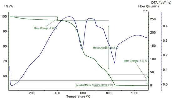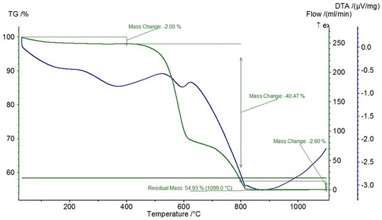 The differential thermal analysis and thermogravimetric analysis (DTA-TGA) reveal that the undersized product of the H-1 sample, enriched with a solid ratio of 30%, exhibits a moisture loss at 55 °C, accounting for a weight reduction of 2.40%. Notably, the distinctive decomposition characteristics associated with huntite ores provide evidence that the first decomposition occurs at 600 °C, resulting in a weight loss of 40.78%, followed by a second decomposition at 800 °C, with a weight loss of 55.63%. The residual 1.8% weight is completely lost at 1099 °C. Similarly, the undersized product of the H-2–3 sample, enriched with a 30% solid ratio, displays a moisture loss at 50 °C, corresponding to a 2% reduction in weight. The thermal decomposition profile reveals the occurrence of the first decomposition at 600 °C, with a weight loss of 40.47%, followed by a second decomposition at 800 °C, resulting in a weight loss of 54.93%. The remaining 2.60% weight is lost at 1099 °C.