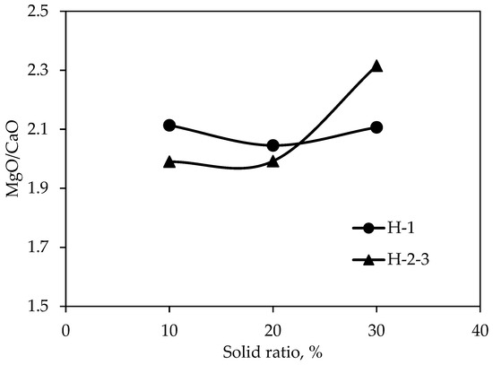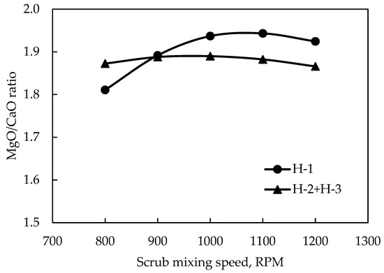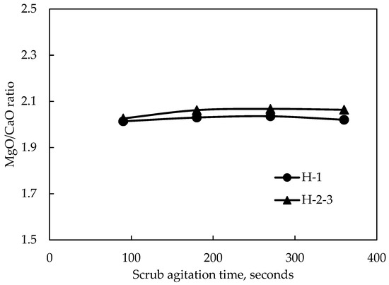 As illustrated in Figure 8, the influence of mixing time on the MgO/CaO ratio appears to be insignificant for both H-1 and H-2–3 samples. Nonetheless, the H-2–3 sample consistently exhibits a slightly higher ratio across all mixing times compared to the H-1 sample. In light of the marginal difference between the two samples, a mixing time of 270 s was selected. This scrubbing duration resulted in MgO and CaO contents of 31.96% and 15.7%, respectively, for the H-1 sample, and 33.06% MgO and 15.99% CaO for the H-2–3 sample.