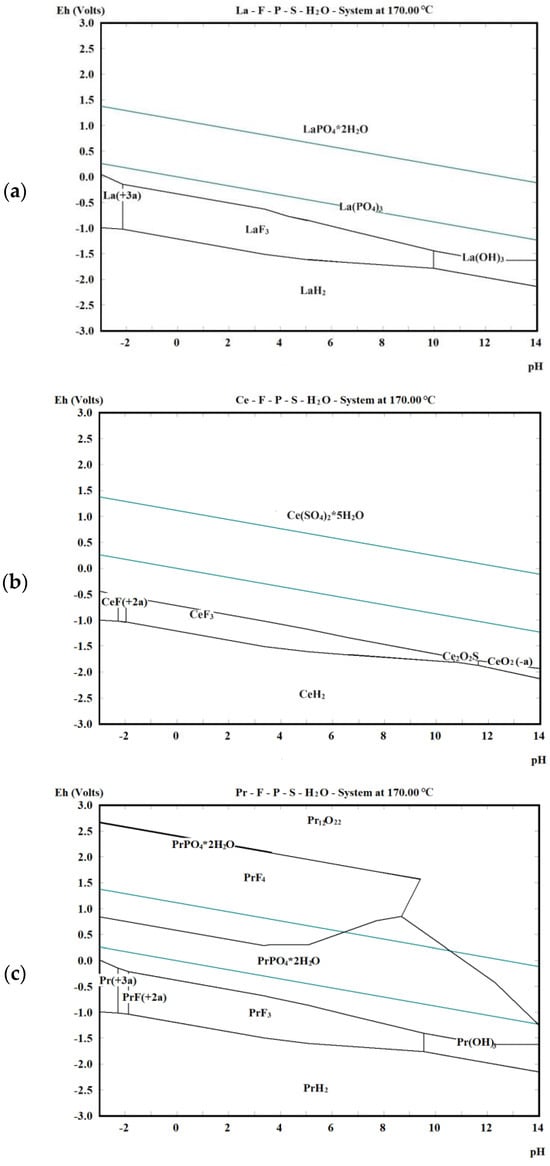Eh-pH diagrams for the RE(La, Ce, Nd)-F-PO4-SO4-H2O system at 170 °C: (a) [La3+] = 1 M, [SO42−] = 1 M; (b) [Ce3+] = 1 M, [SO42−] = 1 M; (c) [Nd3+] = 1 M, [SO42−] = 1 M. (Diagonal lines represent reactions that are involved with both electrons and H+ and OH−-ions. (The chemical formula containing “*” represent crystalline water-containing compounds).