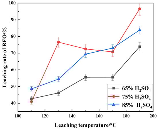 REEs were obtained by H2SO4 solution dissolution of Bayan Obo mixed rare earth concentrate in a beaker using H2SO4 solution. The samples with a mesh size of −200 mesh were leached in an H2SO4 solution (45%~75%wt) which was heated in an oil bath to the desired temperature and time. The leaching liquid and residue were separated through filtrating. After completing the filtration experiment, the leaching residue was washed with distilled water repeatedly to ensure the transfer of rare earth ions to the leaching liquid. The remaining leaching liquid was then dried for further analysis.