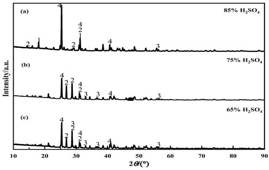 XRD pattern of leaching residues. (a) At 85% H2SO4; (b) at 75% H2SO4; (c) at 65% H2SO4. 1-CeFCO3; 2-CePO4; 3-FeS2; 4-CaSO4.