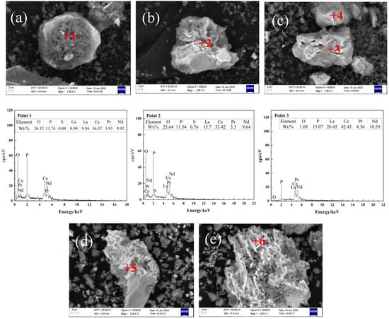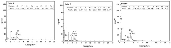 The rare earth concentrate was leached in sulfuric acid solutions with concentrations of 65%, 75% and 85% at 170 °C. The sulfuric acid to rare earth concentrate ratio was fixed at 5:1 (mL/g). And the leaching time was 60 min. Figure 4 illustrates the variation in rare earth leaching rate with temperature in different concentrations of sulfuric acid. As can be seen from the figure, the rare earth leaching rate tends to increase with increasing temperature. Under the same experimental conditions, the rare earth leaching rate shows a trend of first increasing and then decreasing with increasing sulfuric acid concentration. XRD patterns of the leaching residue obtained in different sulfuric acid concentrations are shown in Figure 5. At a sulfuric acid concentration of 65%, there is no diffraction peak of bastnaesite in the XRD pattern of the leaching residue, indicating that the bastnaesite almost has completely decomposed. However, the diffraction peaks of monazite can still be observed. The bastnaesite has decomposed completely, and only a small amount of monazite remains in the leaching residue. As the sulfuric acid concentration increases to 75%, monazite can still be observed in the leaching residue. Continuing to increase the sulfuric acid concentration to 85%, the diffraction peaks of monazite almost disappear, while the bastnaesite diffraction peaks appear in the pattern. Comparing the energy spectrum analysis data of different sulfuric acid leaching residues in Figure 6, it is evident that the P content of the 75% (points 3 and 4) sulfuric acid leaching residue is significantly lower than that of the 65% (points 1 and 2) acid leaching residue. At a sulfuric acid concentrate of 85%, no monazite minerals were found in the leaching residue (points 5 and 6) by SEM-EDS, but the unreacted bastnaesite can be detected. This also confirms that increasing sulfuric acid concentration exacerbates the decomposition of monazite, which is in agreement with the experiments and XRD analysis shown above. Sulfuric acid with a high concentration is not conducive to the decomposition reaction of bastnaesite, while a low concentration sulfuric acid solution is not conducive to the decomposition reaction of monazite [24]. According to rare earth phase analysis of Bayan Obo rare earth concentrate, approximately 70% of rare earth occurs in bastnaesite. That means that the incomplete decomposition of bastnaesite greatly affects the overall leaching rate of the rare earth. The optimal sulfuric acid concentration for leaching is 75%.