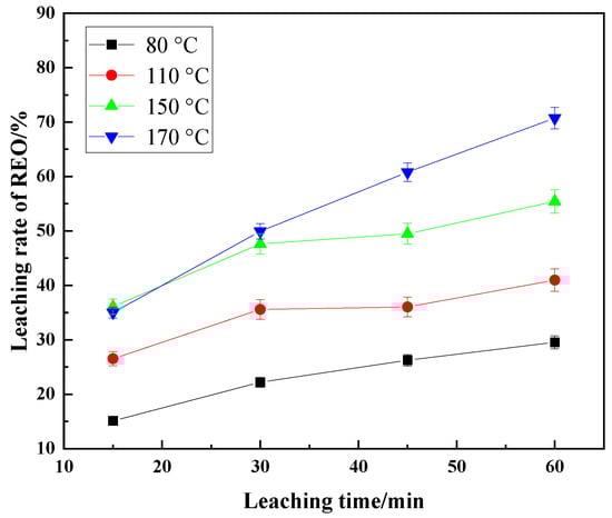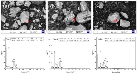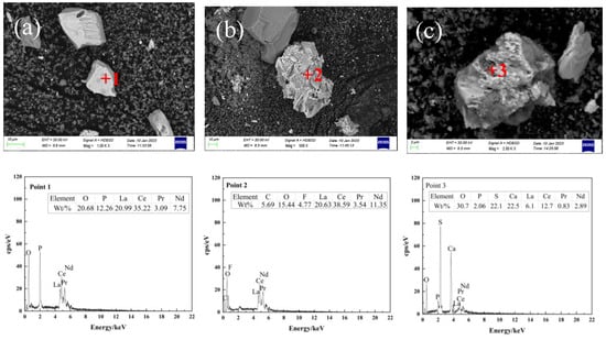 Leaching experiments were conducted at different temperature with 75% sulfuric acid for rare earth concentrate. Other experimental conditions were the same as those in Section 3.1. In Figure 7, the leaching rate of REO increases with the increase in leaching temperature. When the temperature is lower than 150 °C, bastnaesite and monazite are not decomposed completely. The XRD pattern of the leaching residue at 110 °C and 150 °C in Figure 8, as well as the EDS analysis data in Figure 9, also confirmed the existence of these two kinds of rare earth minerals. The surface of the monazite particle does not show any obvious changes at 110 °C, indicating that monazite has not reacted with sulfuric acid completely in this condition. However, corrosion spots appears on the surface of monazite particles at 150 °C, and energy spectrum scanning also detects characteristic peak of the sulfur element, indicating that a slight chemical reaction between monazite and sulfuric acid has occurred at 150 °C. Additionally, some obvious holes resulting from sulfuric acid corrosion appear on the surface of monazite particles, as shown in Figure 8c. The decomposition degree of monazite tends to complete with increasing temperature. The optimal leaching temperature was chosen as 170 °C because the boiling point of 75% sulfuric acid solution is lower than 190 °C.