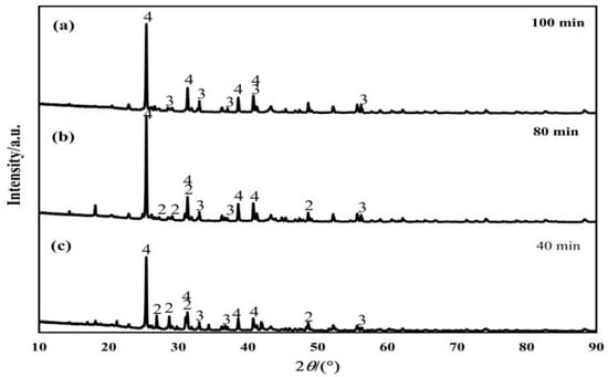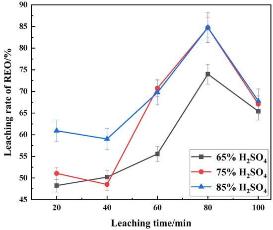Sulfuric acid leaching experiments were carried out by varying the leaching time from 20 to 100 min at 170 °C using 65%, 75% and 85% sulfuric acid solution. Figure 10 shows the variation in rare earth leaching rate with time. Leaching time shows a noticeable effect on rare earth dissolution. The increase in leaching time greatly intensifies the reaction, leading to an increased leaching rate of rare earth. However, the leaching rates of rare earth all begin to decrease when the leaching time exceeds 80 min. The acidity of the sulfuric acid solution gradually increases due to water evaporation, which may cause a decrease in rare earth sulfate solubility in the sulfuric acid solution. In view of this, excessive reaction time is not conducive to rare earth leaching. As can be seen from Figure 11, all of the diffraction peaks of bastnaesite disappear, leaving only a small amount of monazite diffraction peaks at a roasting time of 40 min. When the roasting time is 80 min, the diffraction peaks of monazite are obviously weakened, and the content of monazite in the filter residue is reduced. At 100 min, all of the diffraction peaks of monazite disappear and monazite minerals are decomposed completely. From this perspective, the precipitation of rare earth sulfate is the main reason for the decrease in rare earth leaching rate [25]. Figure 12a–c are SEM-EDS analysis of leaching residue at 40 min, 80 min and 100 min. The rare earth concentrate has decomposed evidently at 80 min and 100 min from the EDS data. The optimal leaching time was determined to be 80 min.