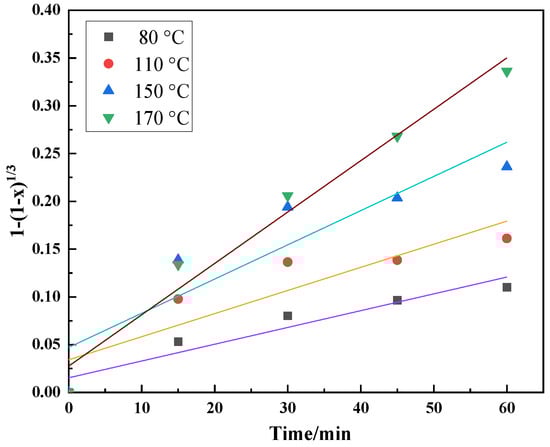 Plots of 1 − (1 − x)1/3 vs. time for different reaction temperatures.