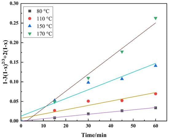 Plots of 1 − 3(1 − x)2/3 + 2(1 − x) vs. time for different reaction temperatures.