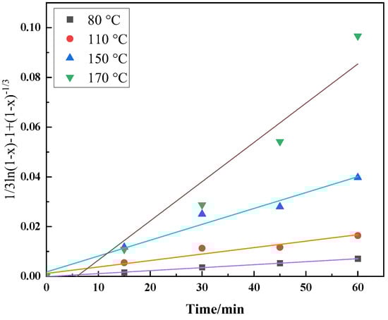 Figure 13 shows the change law of the rare earth leaching rate with time at different reaction temperatures. The data in the figure were respectively substituted into Equations (4)–(6) to obtain the reaction rate constant and determine the rate-controlled part of the leaching reaction through linear fitting. The fitted curves are shown in Figure 14, Figure 15 and Figure 16. From the fitting results, the highest correlation coefficient of the fitted curves in Figure 16 indicates that the sulfuric acid leaching process of mixed rare earth concentrates is controlled by interfacial mass transfer and diffusion through the product layer.