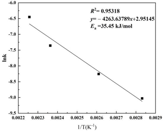 The apparent rate constants of the leaching reaction at different temperatures were calculated based on the mixed control model, and the points of lnk vs. 1/T were calculated and fitted on a curve (Figure 17). The apparent activation energy (Ea) of the reaction was calculated to be 35.45 kJ/mol according to the Arrhenius equation, with an indexing factor determined as 2.72.