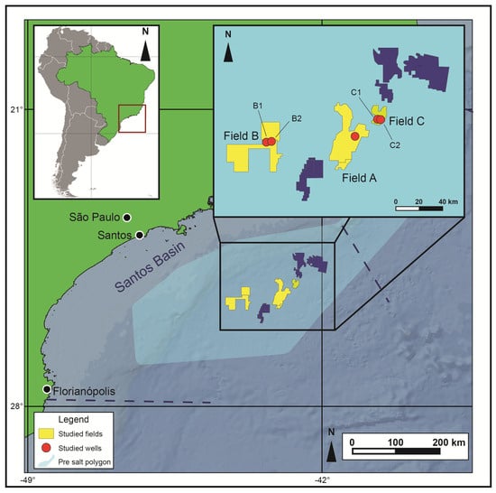 The faciological description of 141.5 m of cores from five wells from three fields in the Santos Basin (Figure 1) was conducted with support of the petrographic characterization of thin sections. Core and petrographic descriptions served as the basis for new sampling for thin section preparation. The exact location and identification of the studied wells and fields are proprietary information and, therefore, cannot be revealed. The wells are identified as well A from field A, wells B1 and B2 from field B, and wells C1 and C2 from field C. Cores and thin sections from wells A, B1, and C1 were described, while B2 and C2 only had thin sections available. Facies were classified according to De Ros and Oliveira [34].